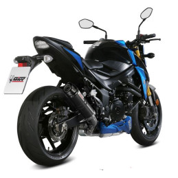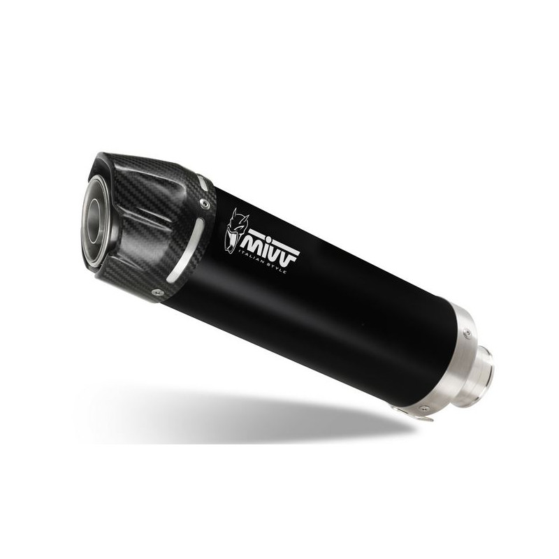 Échappement Mivv GP en acier inoxydable noir avec embout en fibre de carbone.