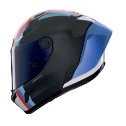 Realizzato in carbonio con 4 misure di calotta esterna, Guanciali con sistema di rimozione di emergenza ed esclusivo sistema di regolazione della posizione della cuffia. Appendice aerodinamica (RAS-Racetrack Aerodynamic Spoiler). Visiera dark smoke e pinlock inclusi nella confezione.