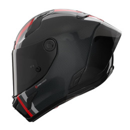 Realizzato in carbonio con 4 misure di calotta esterna, Guanciali con sistema di rimozione di emergenza ed esclusivo sistema di regolazione della posizione della cuffia. Appendice aerodinamica (RAS-Racetrack Aerodynamic Spoiler). Visiera Dark Smoke e pinlock inclusi nella confezione.