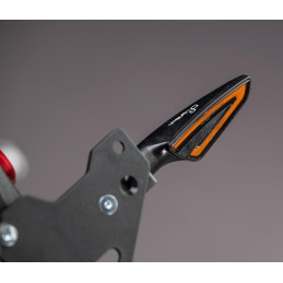 Coppia di indicatori di direzione in ABS. Le frecce sono omologate E8. La lunghezza del singolo indicatore è di 65 mm. La coppia può essere impiegata sia nel lato anteriore che posteriore della moto ed è l'ideale da abbinare ai portatarga Lightech. Questo modello di freccia è stato disegnato, progettato e brevettato interamente da LighTech, che detiene la registrazione del design.