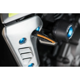 Coppia di indicatori di direzione in ABS. Le frecce sono omologate E8. La lunghezza del singolo indicatore è di 65 mm. La coppia può essere impiegata sia nel lato anteriore che posteriore della moto ed è l'ideale da abbinare ai portatarga Lightech. Questo modello di freccia è stato disegnato, progettato e brevettato interamente da LighTech, che detiene la registrazione del design.
