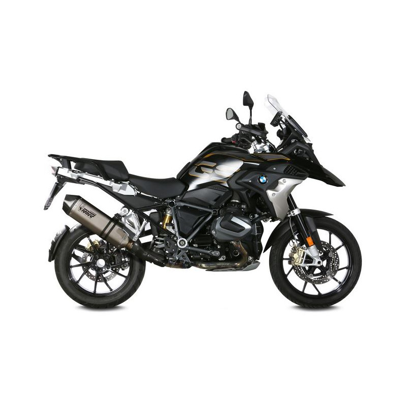 Realizzato con corpo in titanio e con coppa e fascetta di ancoraggio in carbonio, lo scarico è di forma esagonale.
